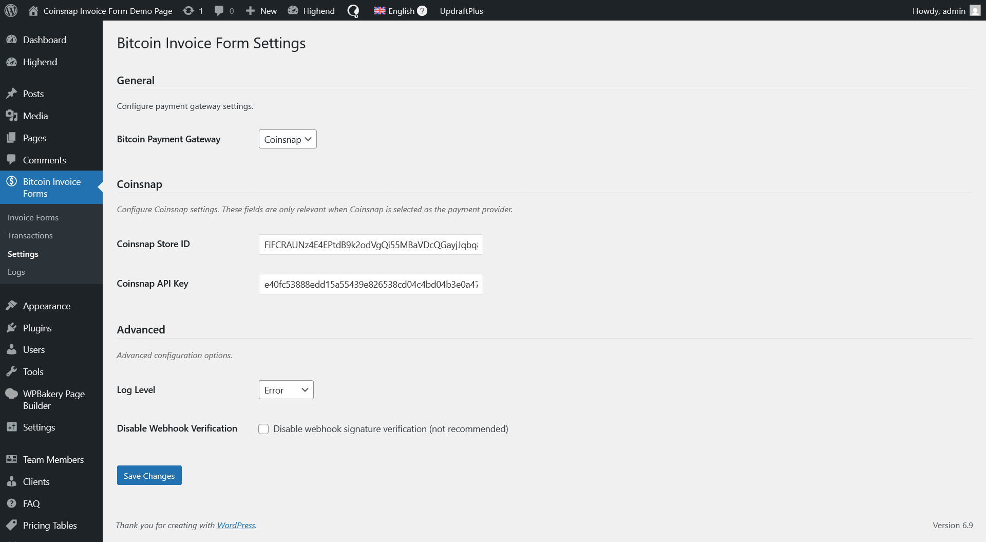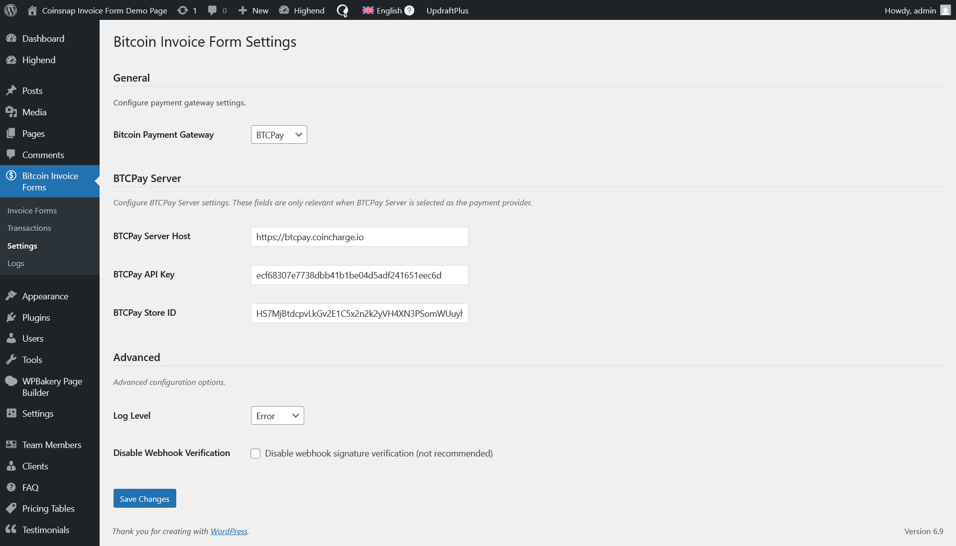 - Go to WordPress Admin Bitcoin Invoice Forms Settings